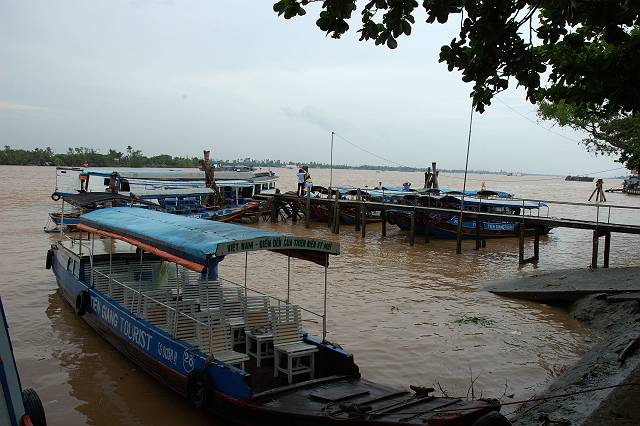 船着き場に到着したが、モーター付きの小さな船が待っていた。10人ものればいっぱいになるような船だった。とにかくこの船で中州に向かう。