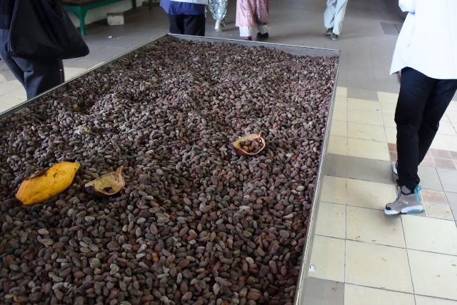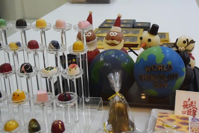 店の前にカカオの木があり、木にぶら下がるカカオの実を初めて見ました。店内にはいろいろなチョコが並んでいました。試食ができ、どれも美味しくて、お土産に少し買いました。